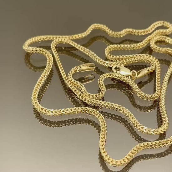 Enhance your jewelry collection with our 14K solid gold Franco chain, designed for those who appreciate elegance and durability. With a sleek 2mm width, this chain offers a refined look, perfect for everyday wear or layering with other pieces. Carefully crafted to ensure lasting shine and strength, it’s a timeless addition to any jewelry collection.